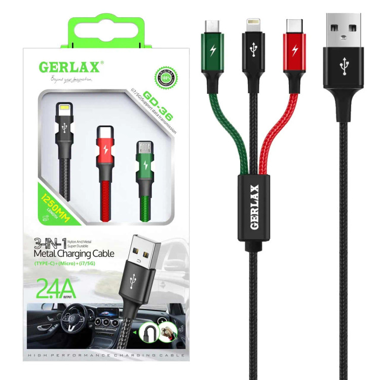 🔌کابل شارژ سهکاره GERLAX GD-36 – همهکاره، مقاوم و سریع